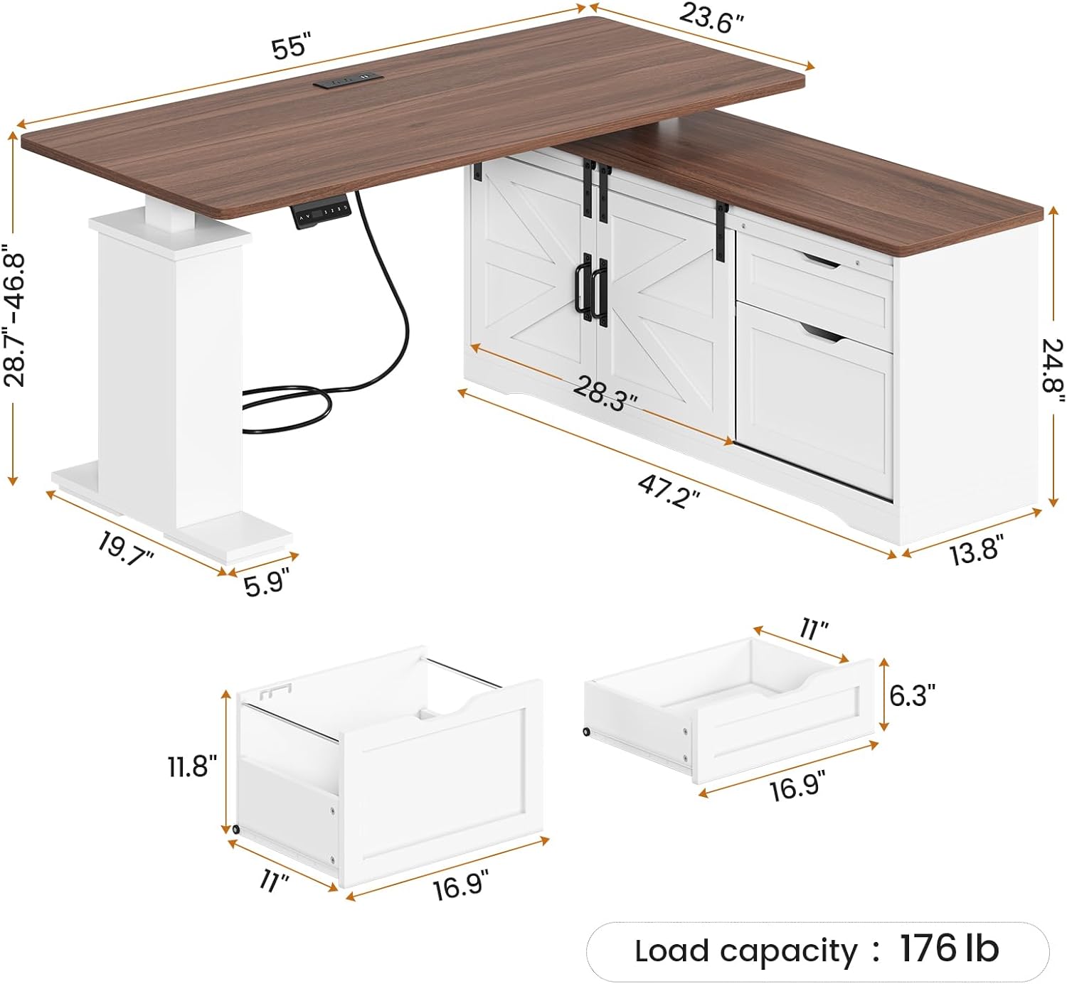 SEDETA Farmhouse L Shaped Standing Desk, 55 inch Height Adjustable Corner Desk with Storage Drawers, Standing Computer Desks with Power Outlets for Home Office, White